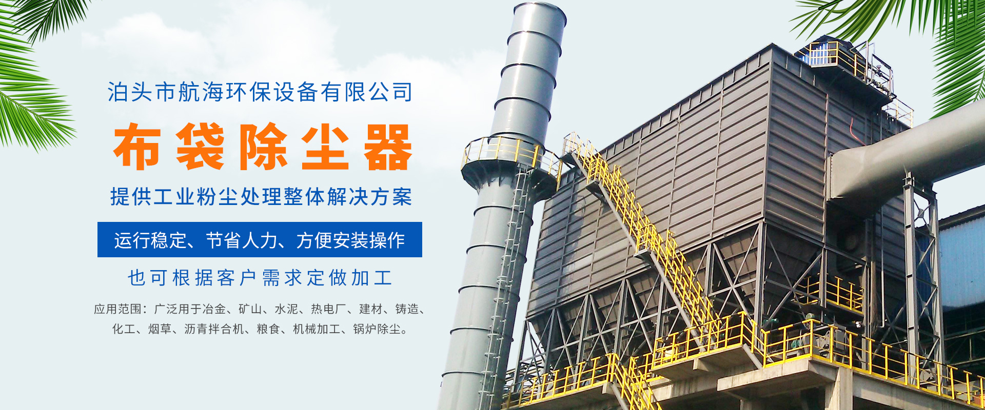 航海環保設備有限公司主要生產:布袋除塵器,單機除塵器,旋風除塵器,脫硫除塵器,木工除塵器,鍋爐除塵器,礦山除塵器,靜電除塵器等除塵設備,以及除塵器骨架...